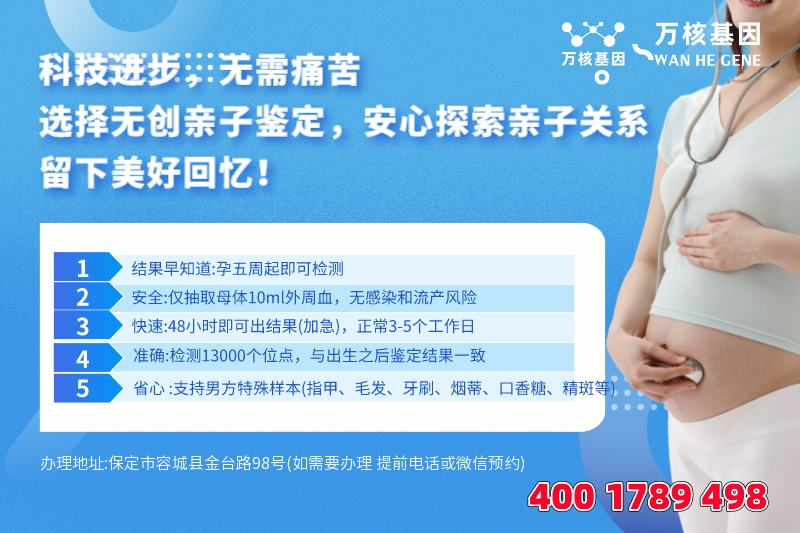 如果你需要办理容城dna胎儿亲子鉴定,可在线咨询容城亲子鉴定基因检测。容城dna胎儿亲子鉴定只需采集准妈妈10ml外周血,疑似父亲可以采集血液样本,或者是血痕、精液、精斑、带毛囊的头发、指甲、唾液、口香糖、口腔拭子、牙线、烟头等(任选其一即可)等鉴定样本,测试它们之间的DNA信息是否匹配。这种测试可以确定一个孩子是否为某个人的亲生子女,或者确定两个人是否具有亲缘关系。